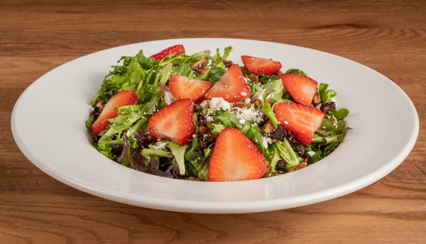 Mixed greens topped with grilled chicken, strawberries, candied pecans and goat cheese, served with raspberry vinaigrette dressing. (Sub Crispy Chicken)