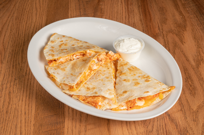 Flour tortilla filled with grilled chicken layered with queso, cheddar cheese and salsa grilled to perfection. Served with sour cream. Make it Buffalo style with our Original (Medium) Anchor Bar wing sauce.