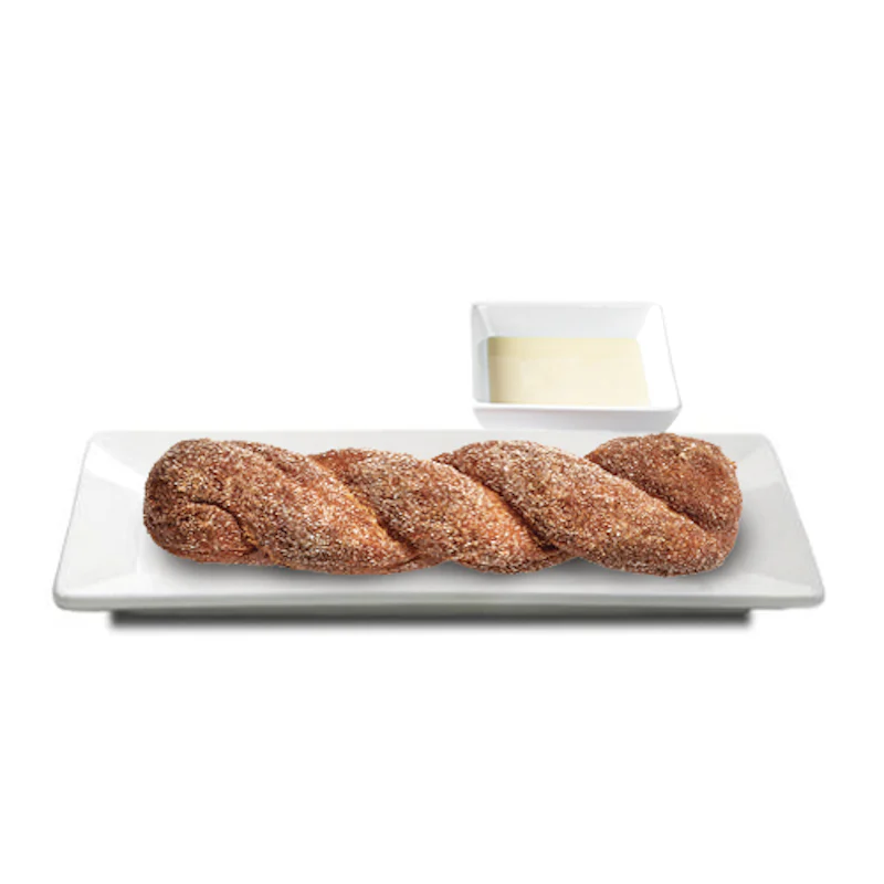 One traditional soft and fluffy Korean donuts coated with cinnamon and sugar on the outside, served with a sweet cream dipping sauce.