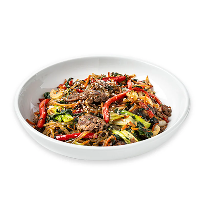 Glass noodles, red bell pepper, carrots, onions, spinach, mushrooms and bulgogi stir-fried with Soy Garlic sauce and topped with sesame seeds. (*Contains sesame seeds or sesame seed oil.)