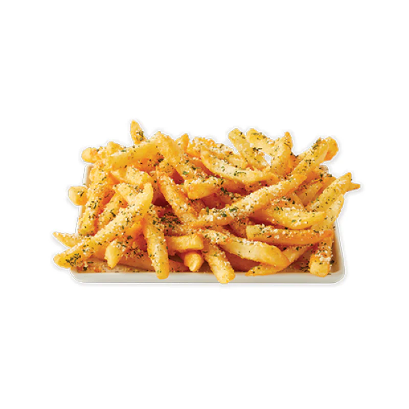 French fries topped with a garlic seasoning, parmesan cheese, and parsley flakes.