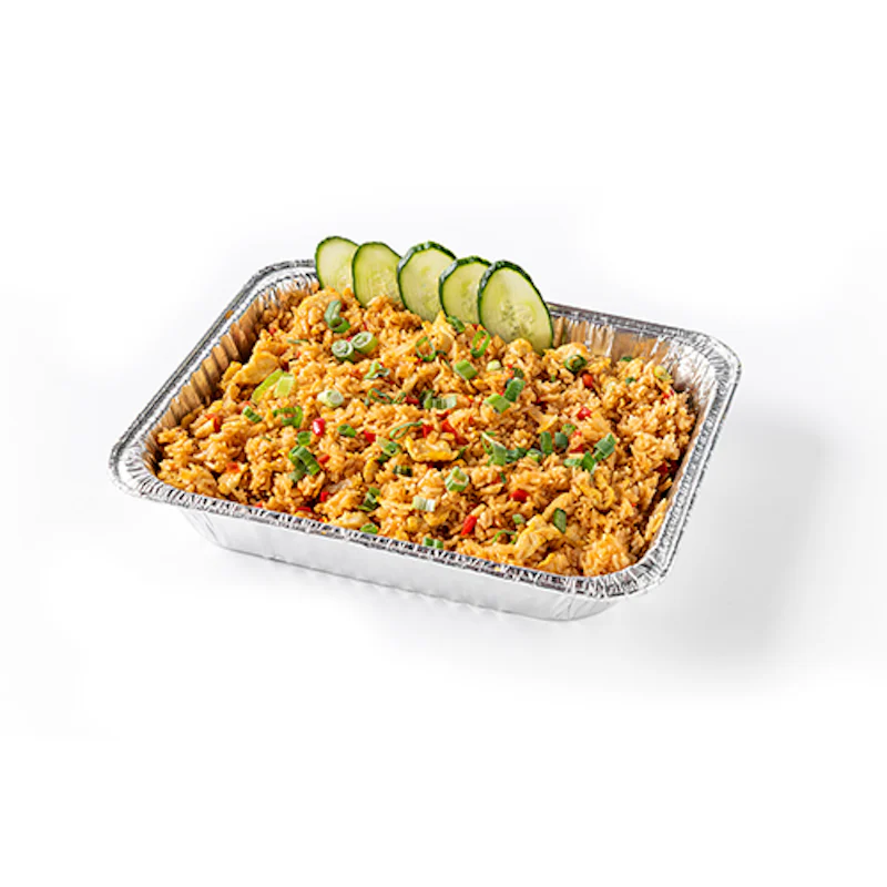 Fried rice, eggs, sesame seeds, red bell peppers, onions, scallions, cooked with Soy Garlic sauce, topped with sesame seeds and fresh cucumber garnish.