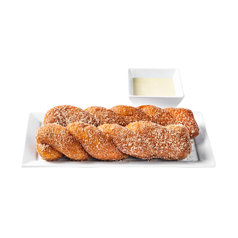 Two traditional soft and fluffy Korean donuts coated with cinnamon and sugar on the outside, served with a sweet cream dipping sauce.